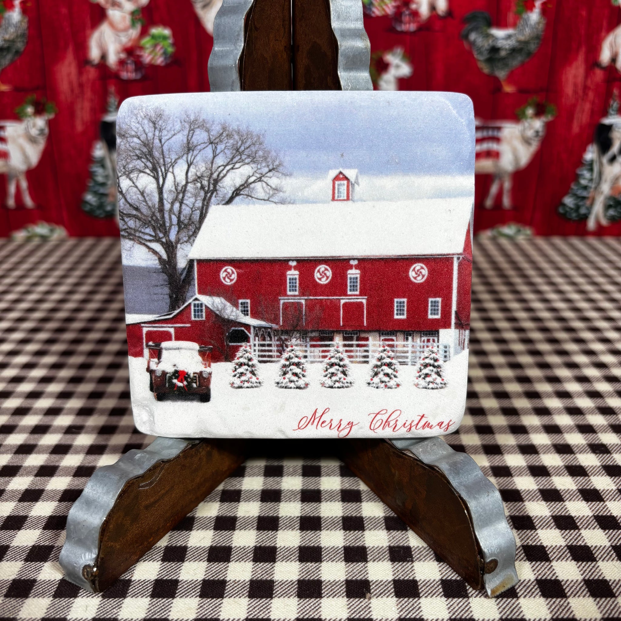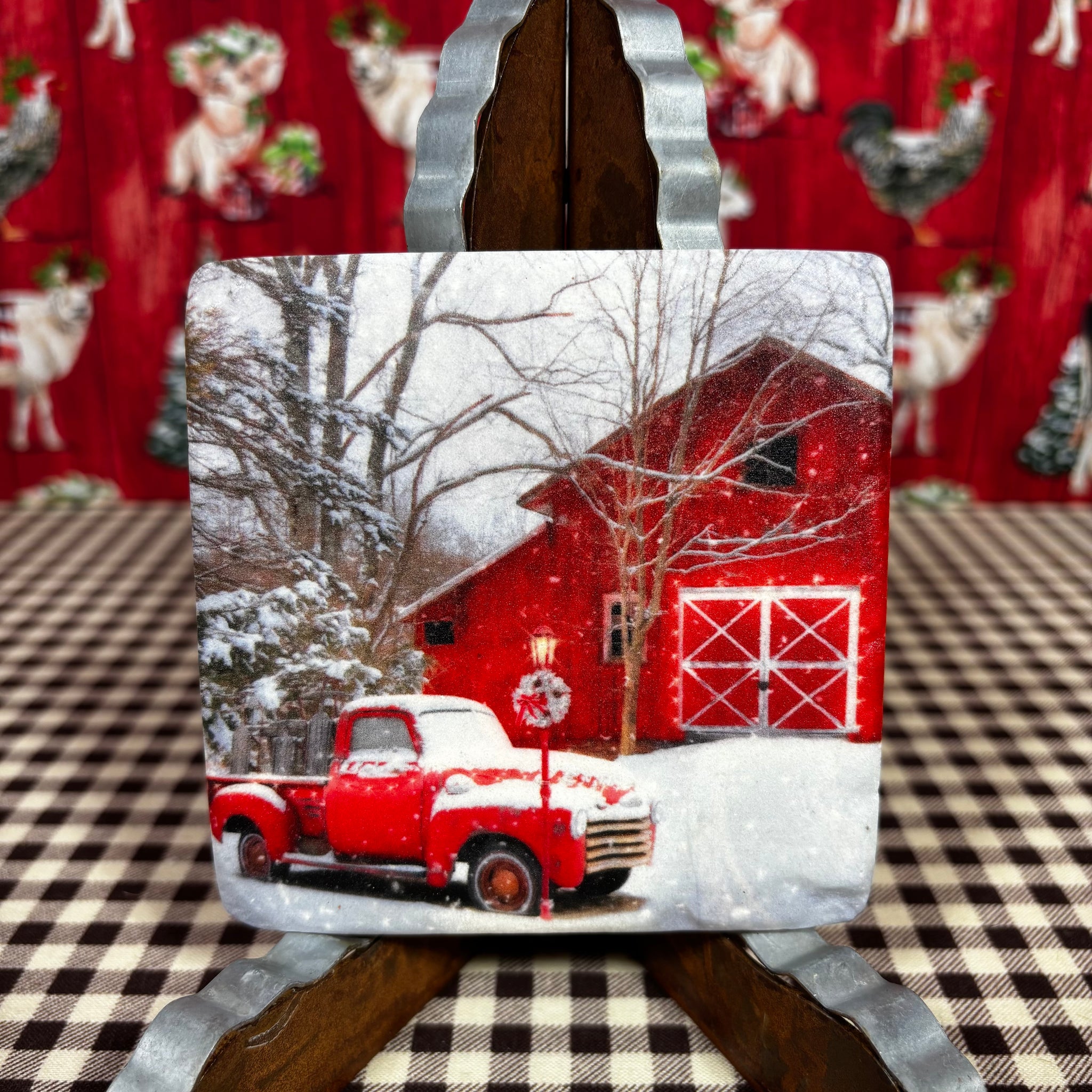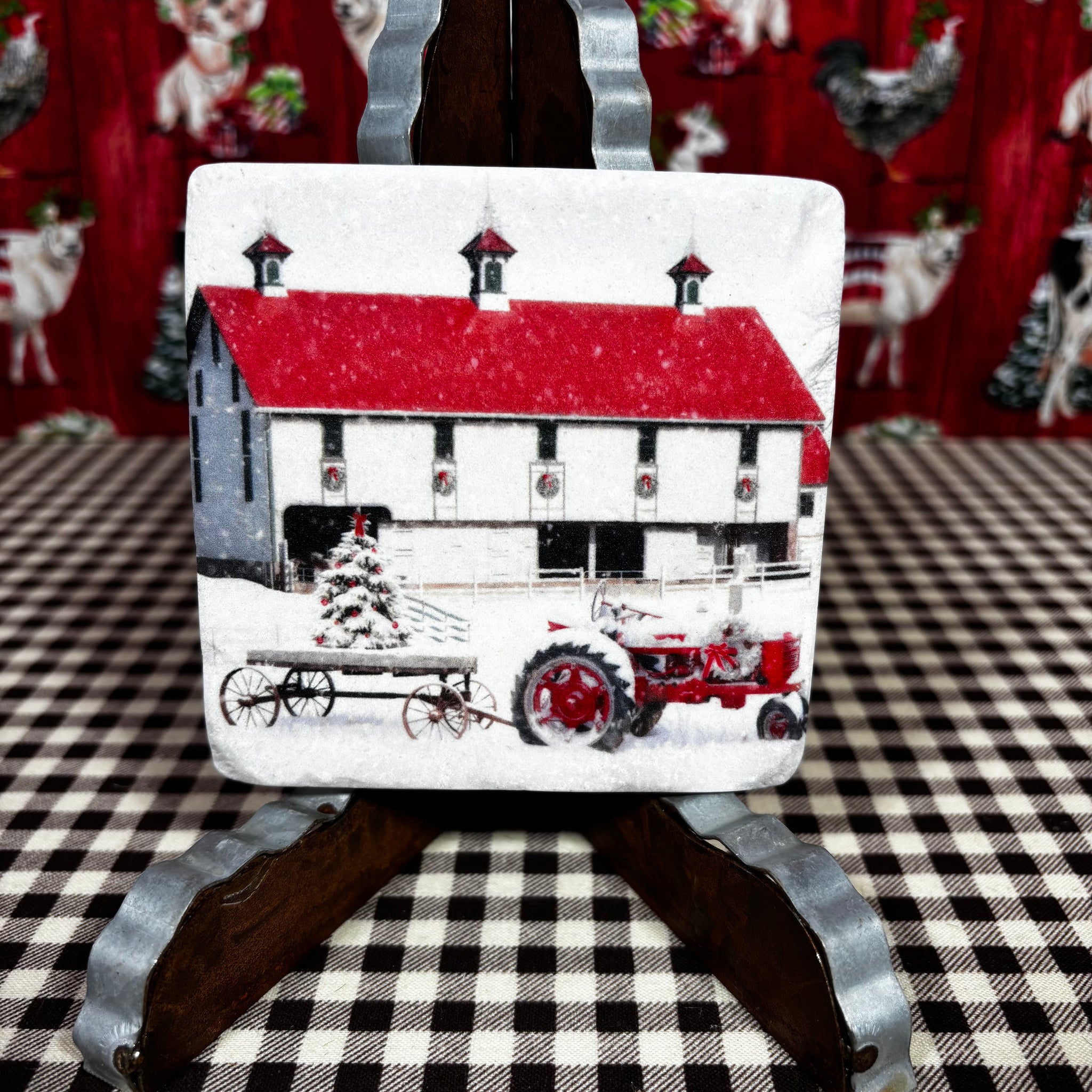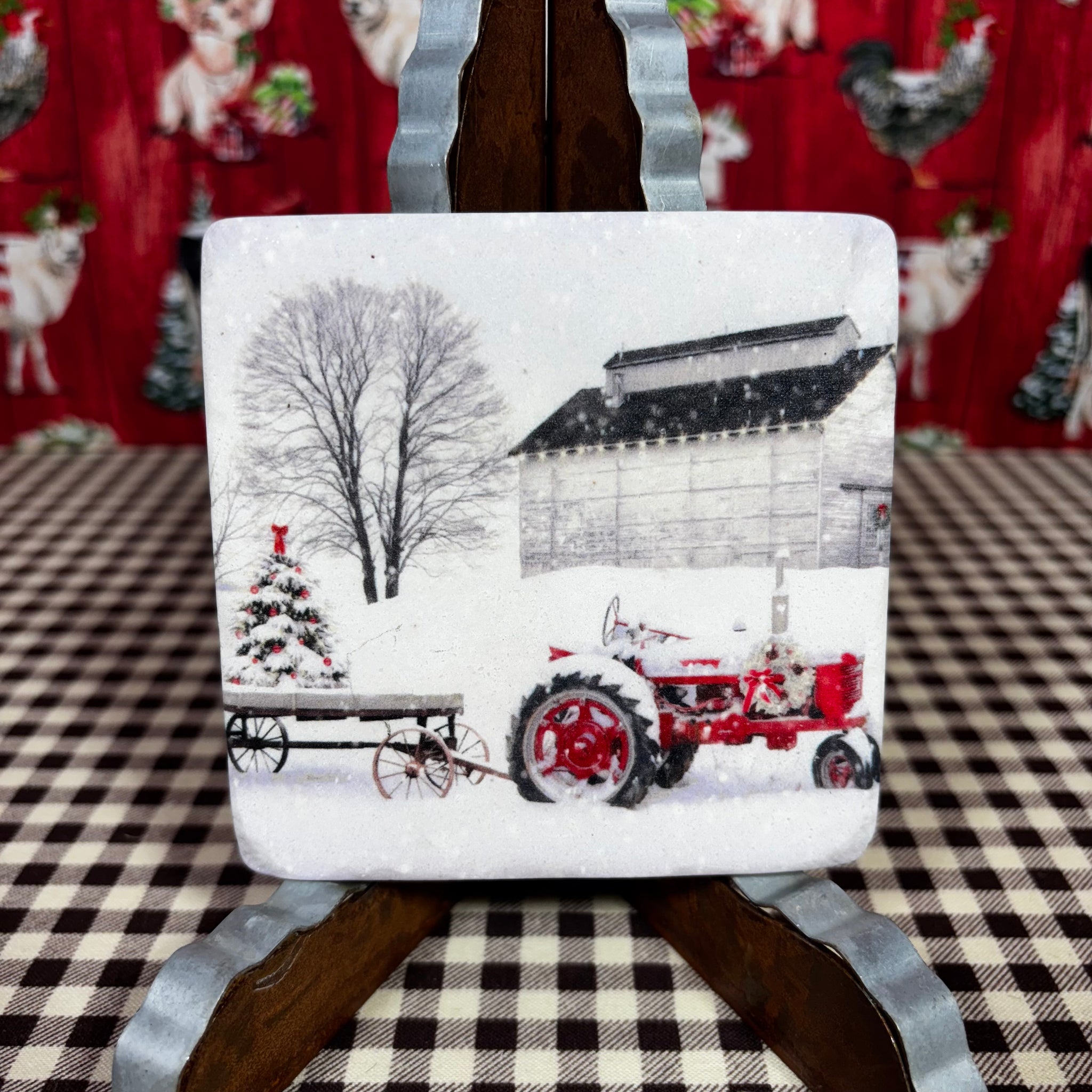 Our farmhouse snowy coasters will be fun to set out at the holidays. The red barns, tractors, and trucks set the country scene.