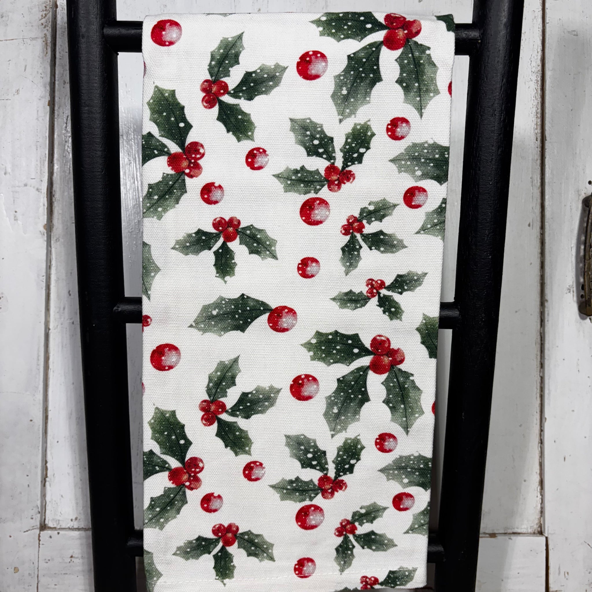 This holiday kitchen towel has bright red and green holly leaves. Great gift idea for your favorite hostess!