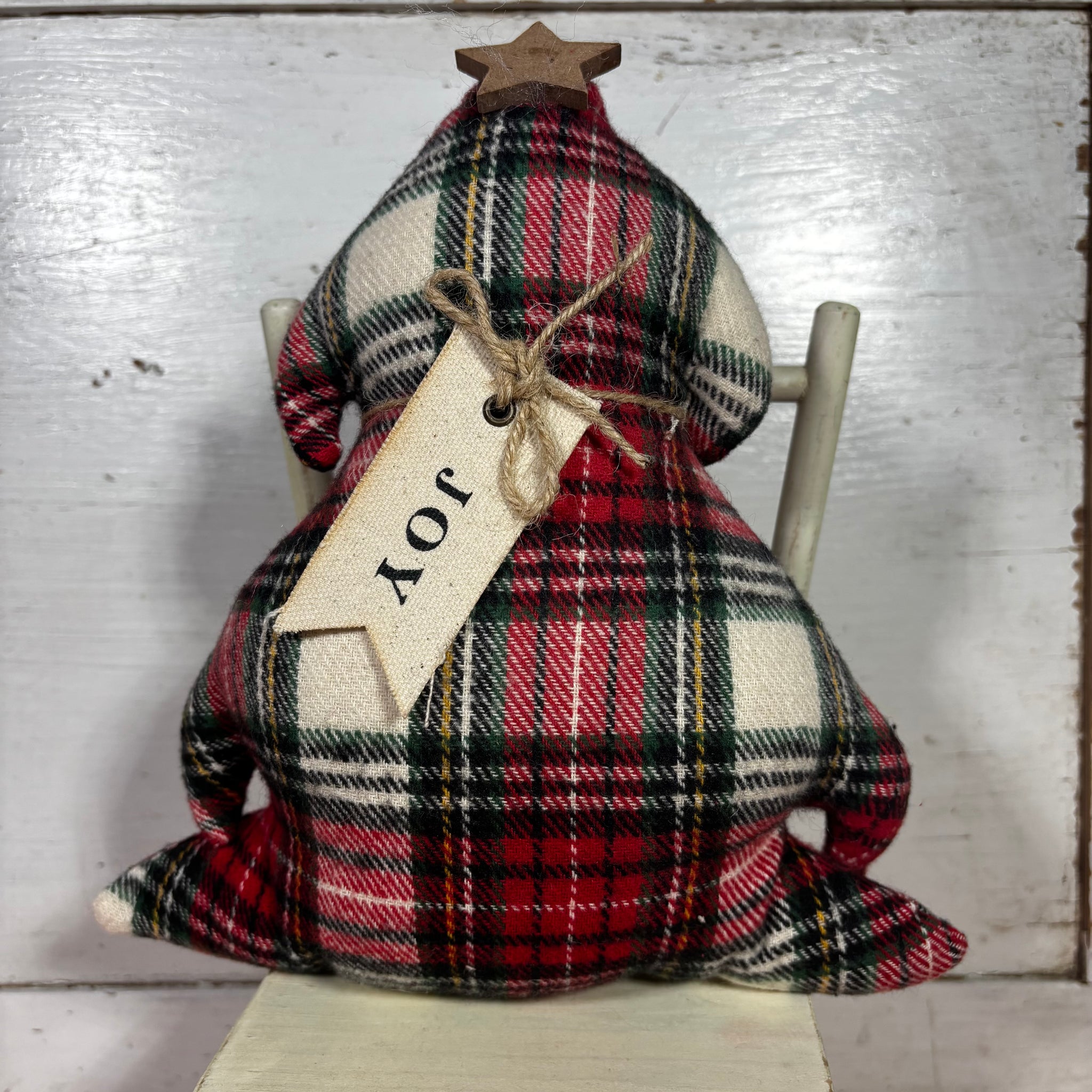 Tree shaped Pillows with Christmas words on their tags. They are finished off with a star at the top.