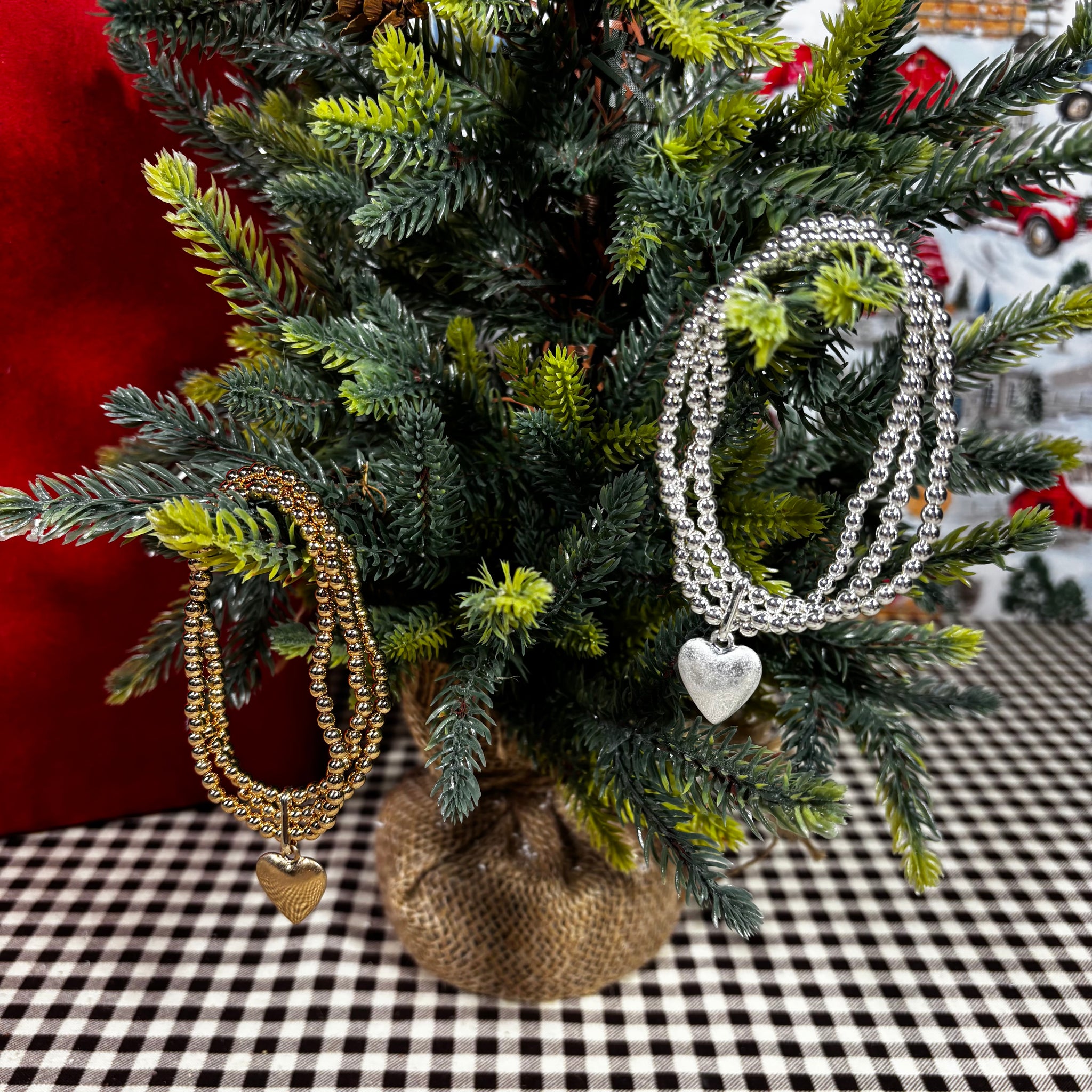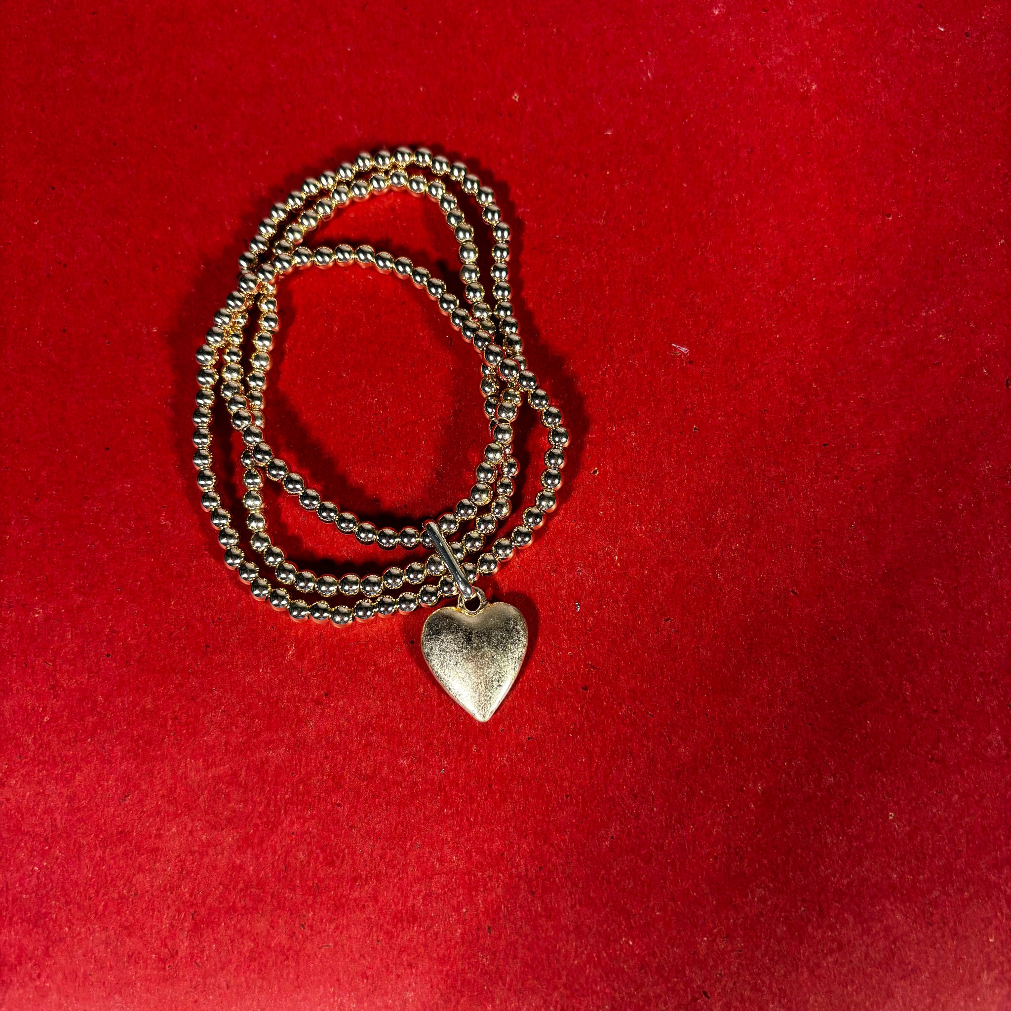 Three stands of beads with a heart charm make up this bracelet. They are simple in design but, can be dressed up or down!