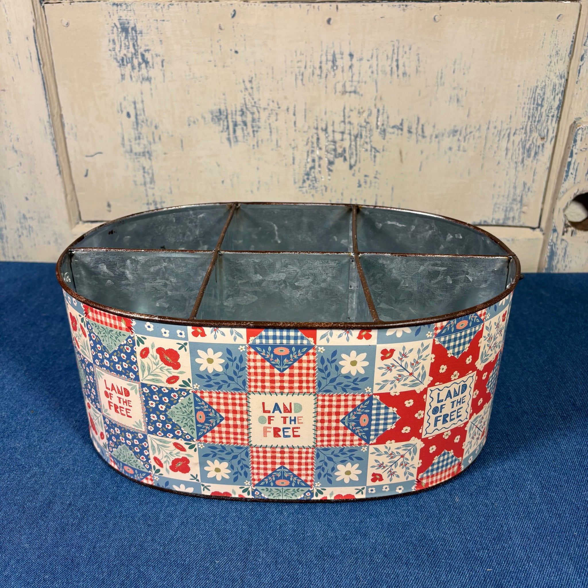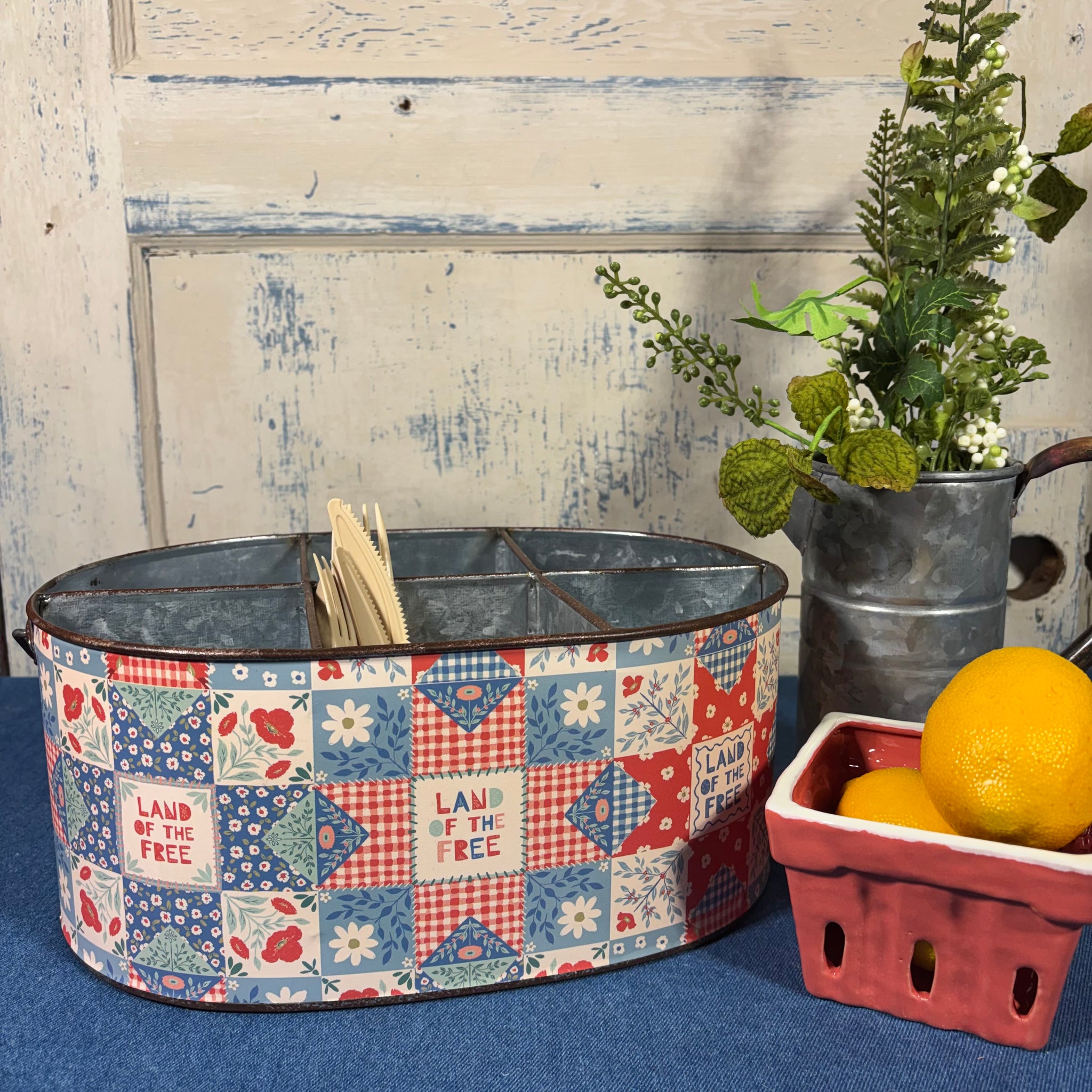 You'll be ready for a picnic or backyard BBQ with this handy 'Land Of The Free' Caddy with a handle. The patchwork design in Americana blues, reds and white is so fun.