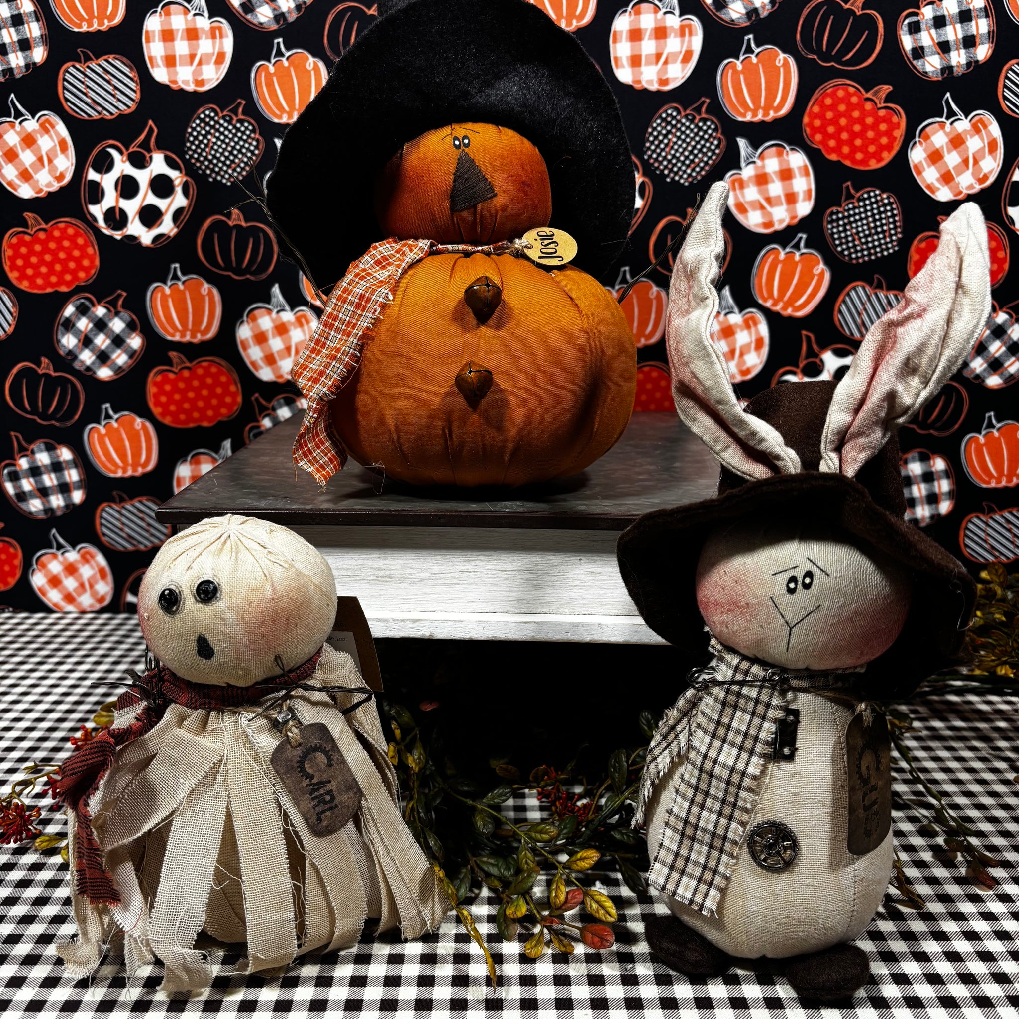 They are all friends for the fall season! They have movable arms and ears to position how you would like. Their fun buttons and name tags will be a great addition to your decor.